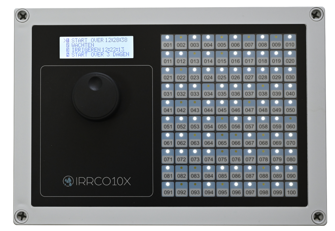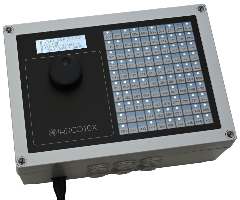 De IRRCO10X irrigatie computer kenmerkt zich door modulaire opbouw en eenvoudige bediening. Hij kan eenvoudig samengesteld worden als simpele beregeningscomputer of uitgebreid worden tot een irrigatiecomputer voor meerdere zones. Denk hierbij aan de buitenberegening gecombineerd met een tensiometer, de dakberegening met een temperatuursensor en met een hygrometer kan de luchtvochtigheid in een kas geregeld worden. Op hetzelfde moment is elders druppel bevloeiing met een watergift in liters actief is. Met name het cycli’s beregenen met behulp van de irrigatieklokken in combinatie met sensoren maakt de IRRCO10X bijzonder geschikt voor onder andere: